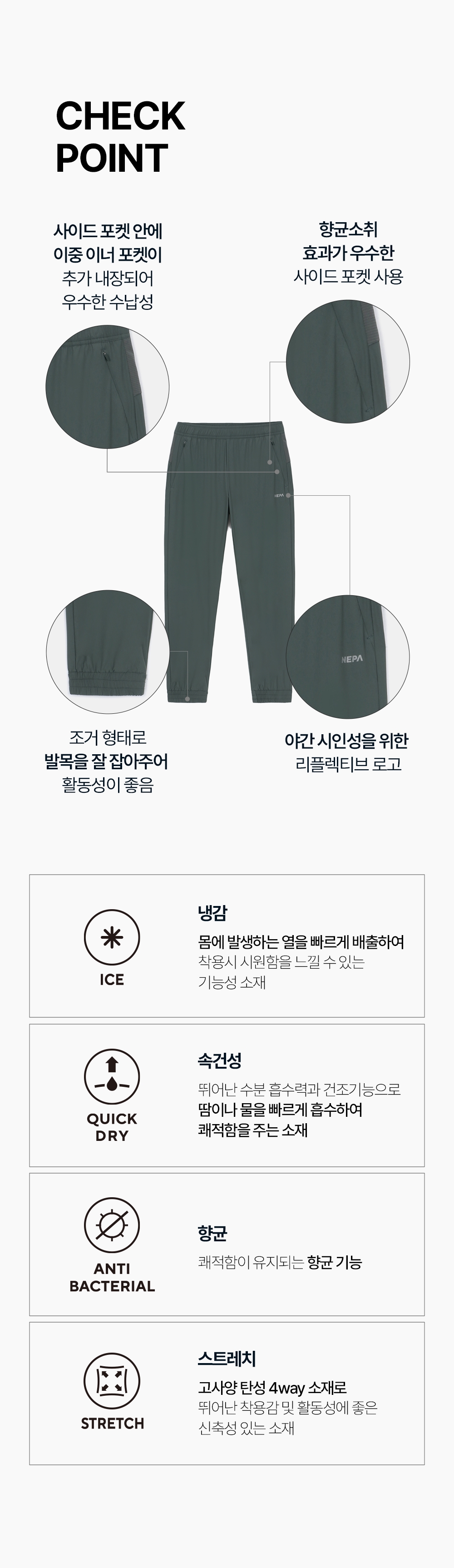 - 나일론 접촉 냉감 원사를 사용하여 시원한 착용감과 뛰어난 스트레치 기능으로 편안한 활동성을 제공