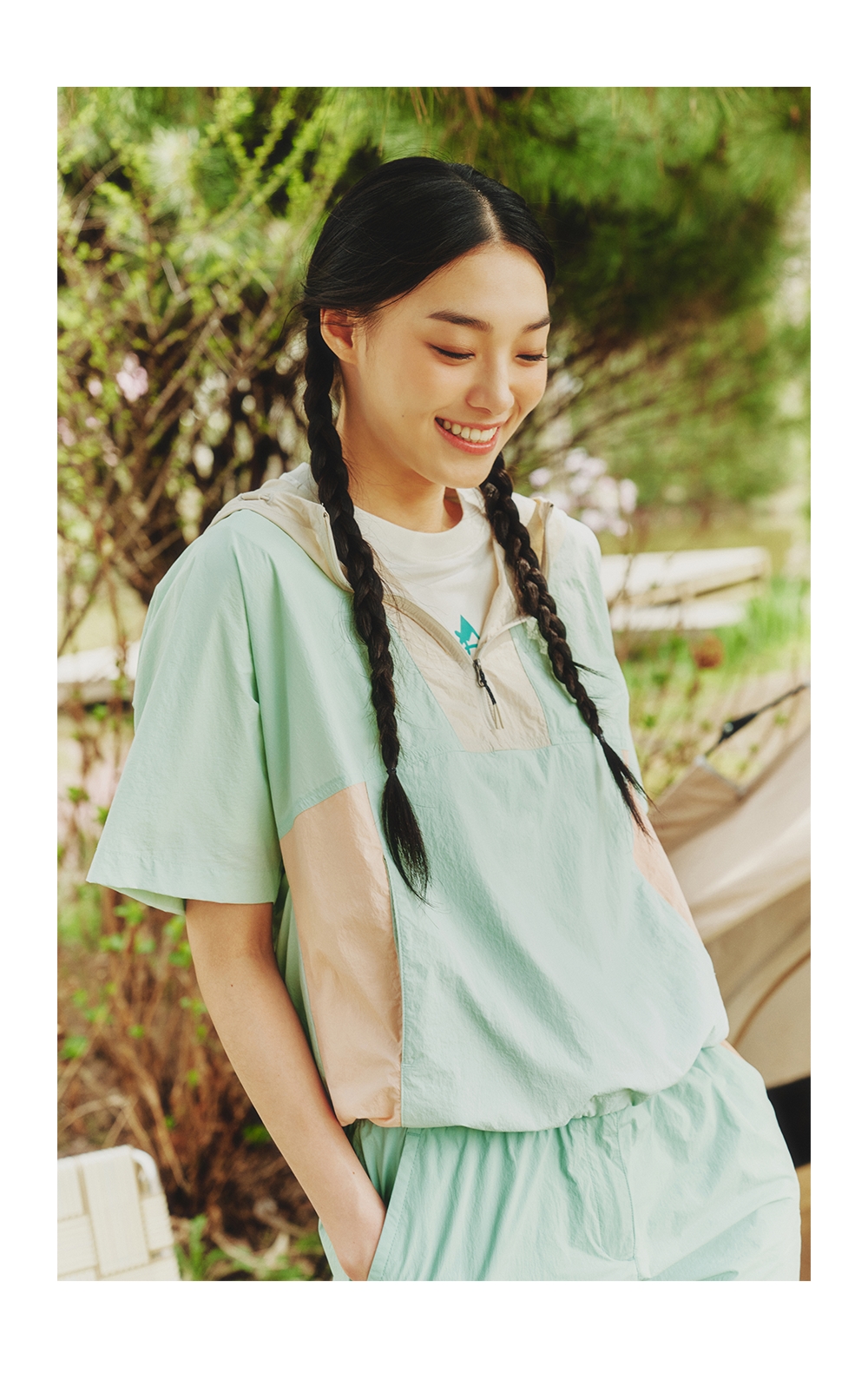 - 밑단에 스트링이 있어, 상황에 따라 방풍 기능 활용 및 스타일 연출 가능