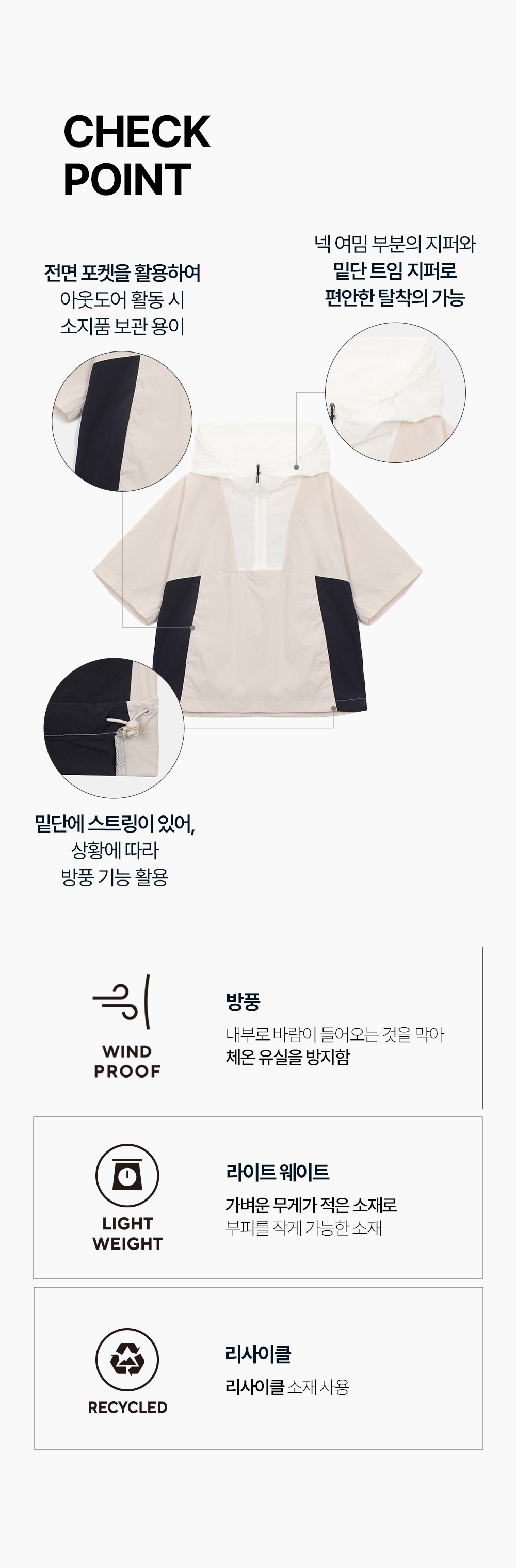 - 밑단에 스트링이 있어, 상황에 따라 방풍 기능 활용 및 스타일 연출 가능
