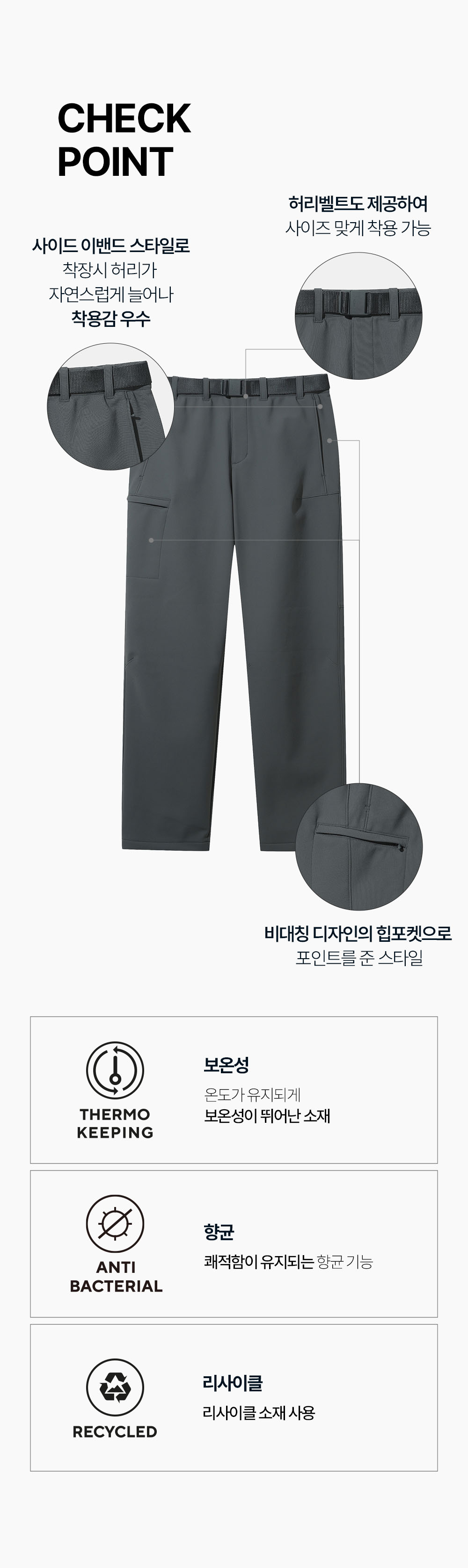 - 안쪽 기모원단에 중공사를 사용하여 가볍고 보온성을 높인 웜팬츠 스타일