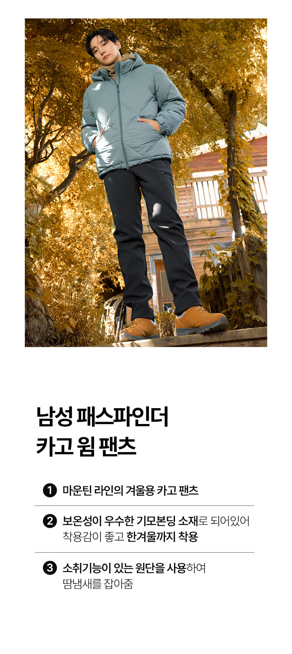 - 안쪽 기모원단에 중공사를 사용하여 가볍고 보온성을 높인 웜팬츠 스타일