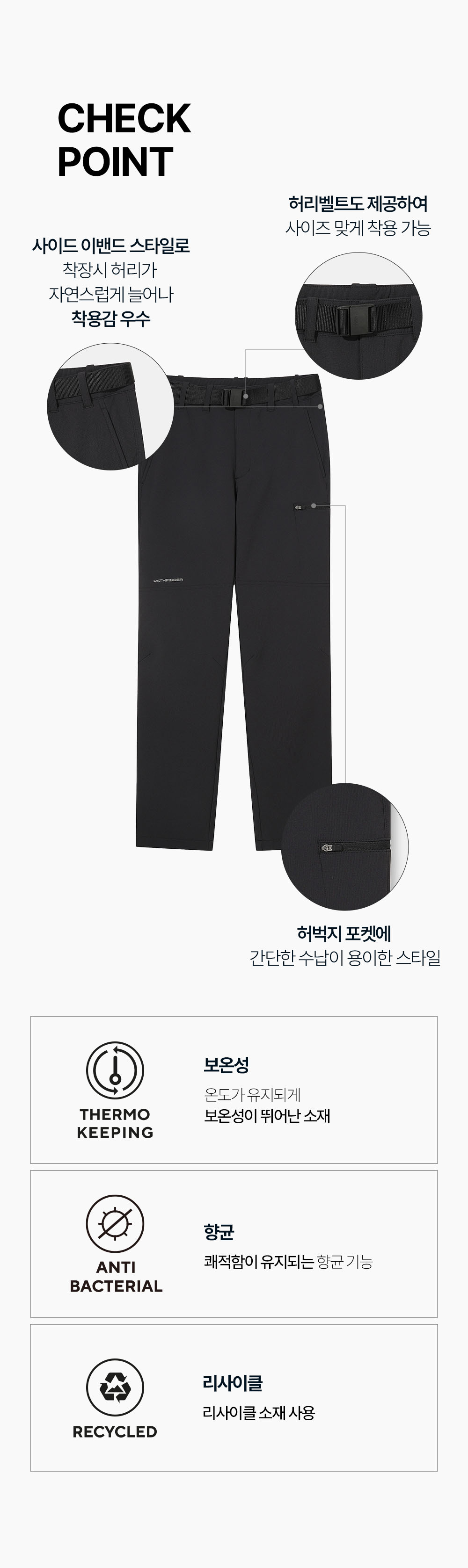 - 사이드 이밴드 스타일로 착장시 허리가 자연스럽게 늘어나 착용감 우수