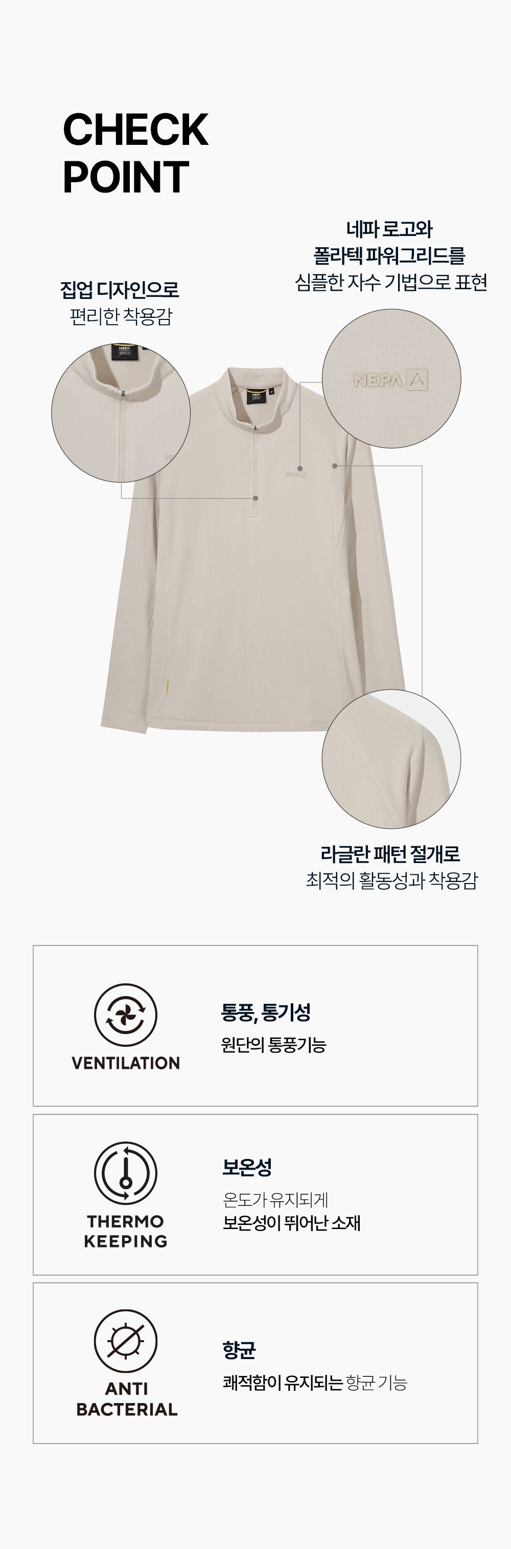 - 폴라텍(POLARTEC)의 파워그리드 소재를 사용하여 통기성과 보온성에 효과적인 상품 (수분을 외부로 배출시켜주는 탁월한 통기성과 쾌적한 보온성의 기능성 소재)