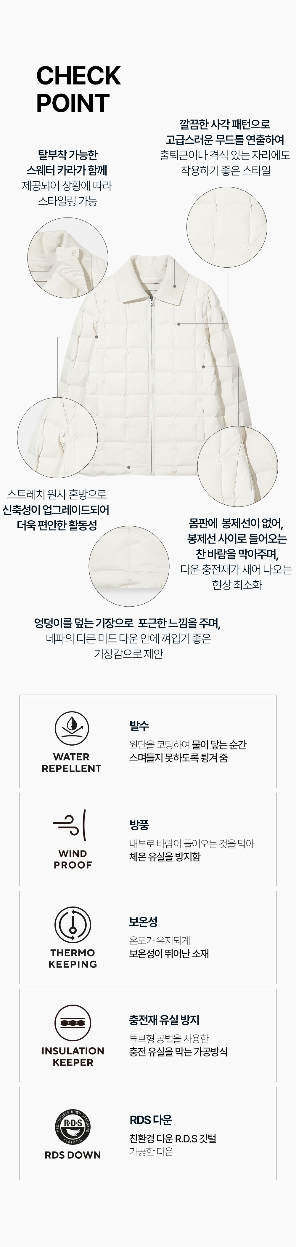 - 엉덩이를 덮는 기장으로 포근한 느낌을 주며, 네파의 다른 미드 다운 안에 껴입기 좋은 기장감으로 제안