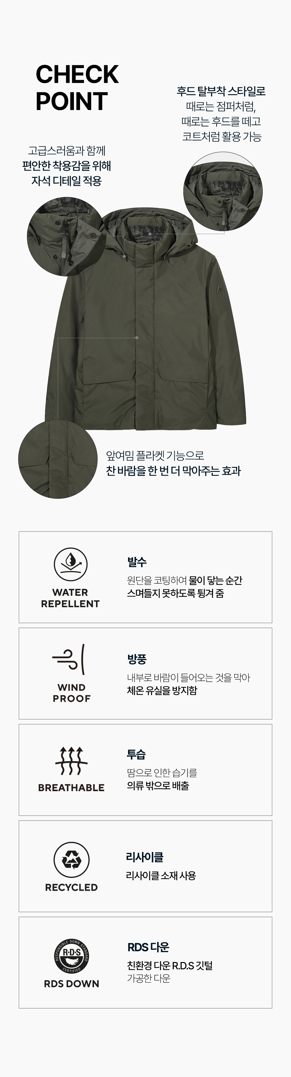 - 후드 탈부착 스타일로 제안하여 때로는 점퍼처럼, 때로는 후드를 떼고 코트처럼 활용 가능