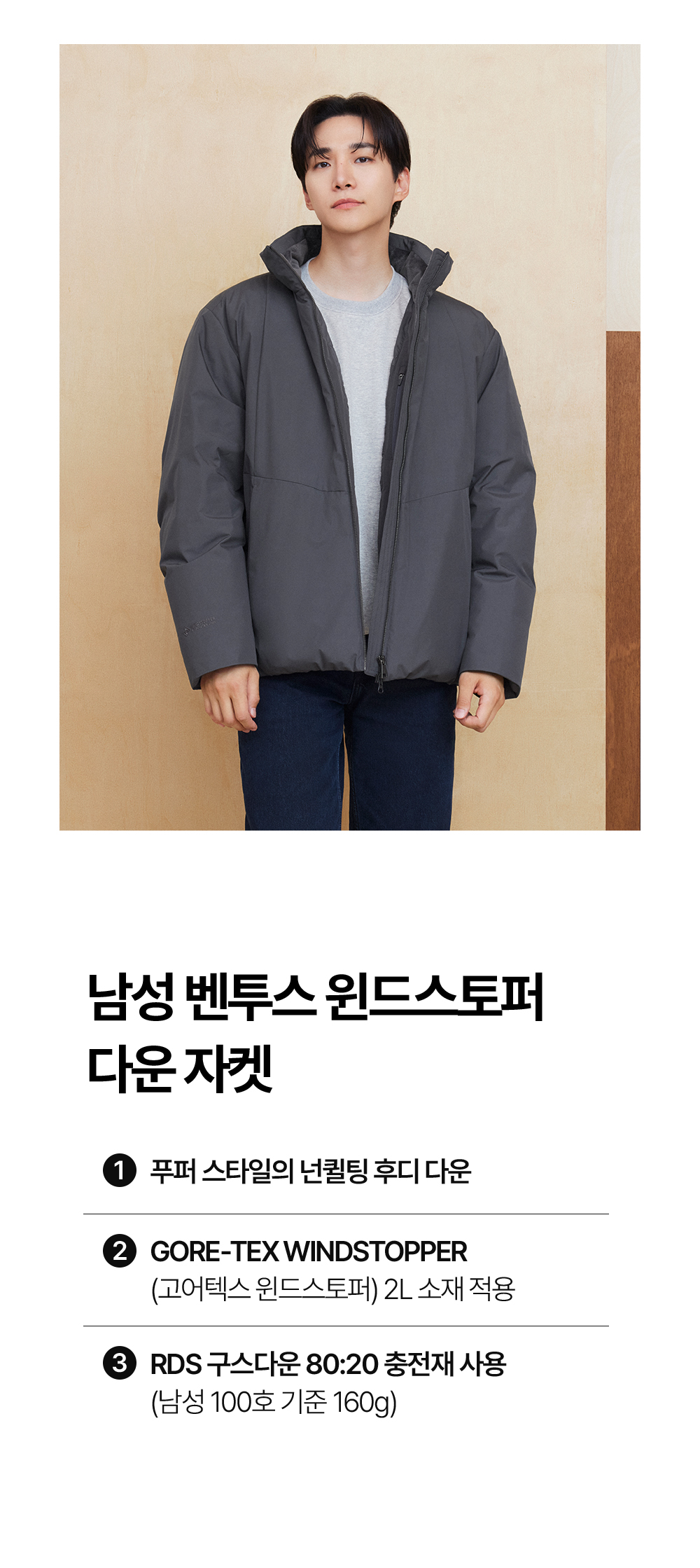 - RDS 구스다운 80:20 충전재 사용 ( 남성 100호 기준 160g )