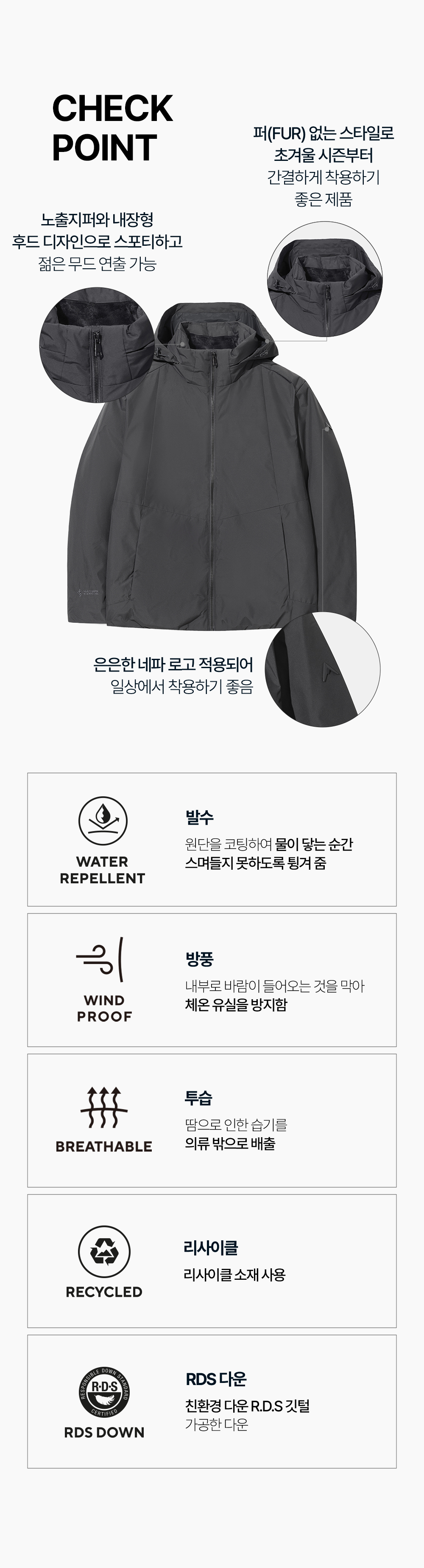 - RDS 구스다운 80:20 충전재 사용 ( 남성 100호 기준 160g )