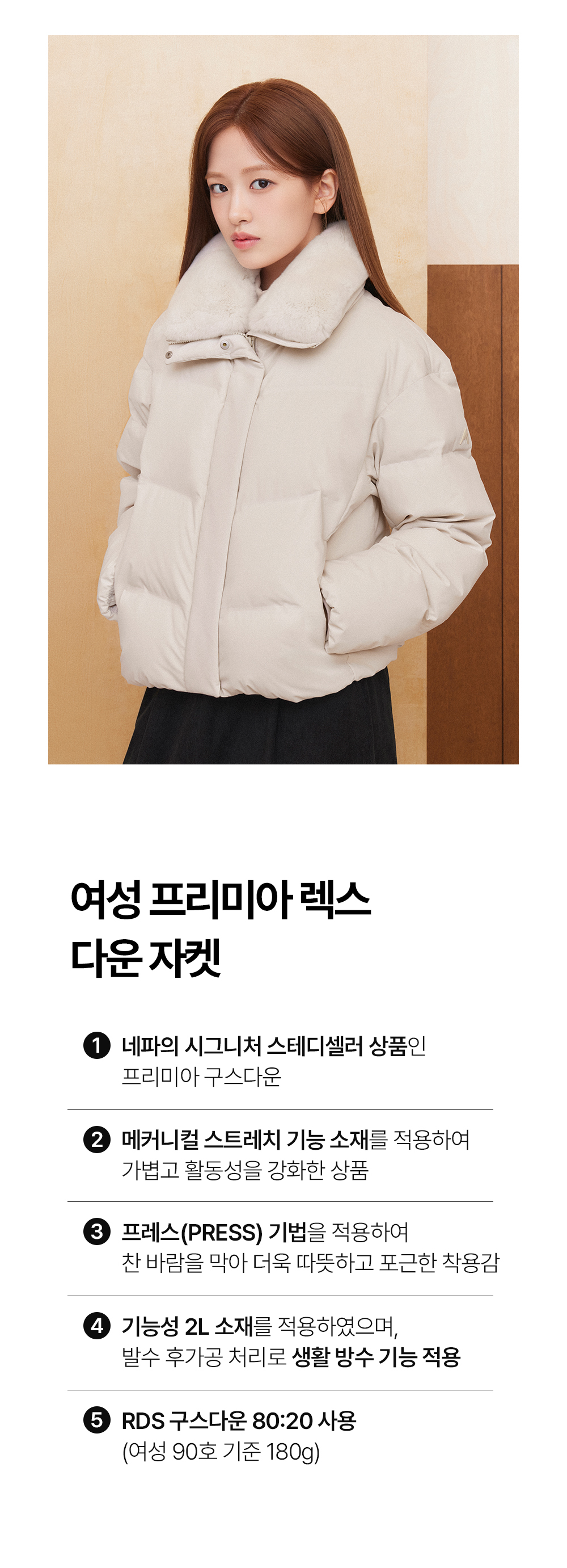 - 프레스(PRESS) 기법을 적용하여 찬 바람을 막아 더욱 따뜻하고 포근한 착용감
