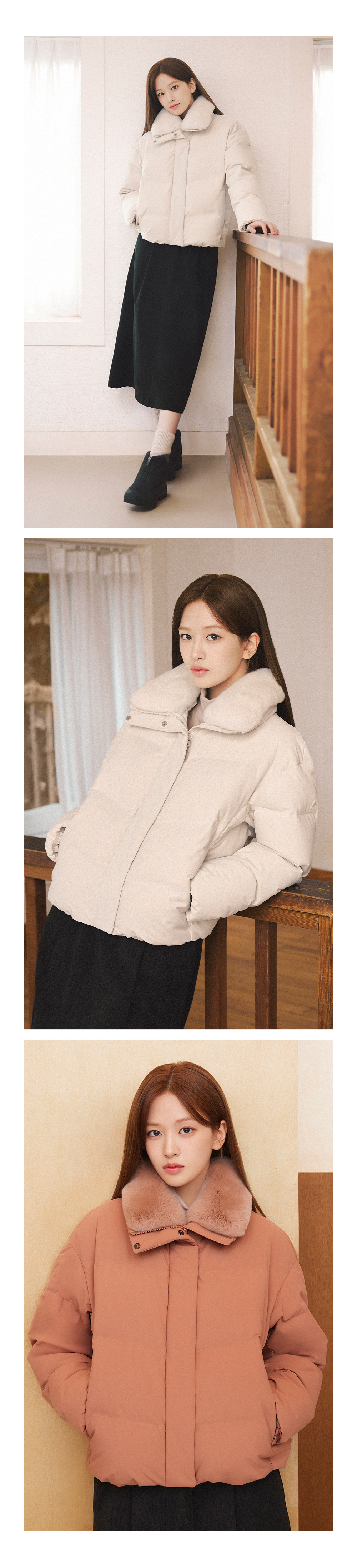 - 탈부착 가능한 REX(토끼털) 퍼 를 윙 카라로 연출하거나, 털을 떼고 간결하게 착용 가능한 2WAY 스타일 제안