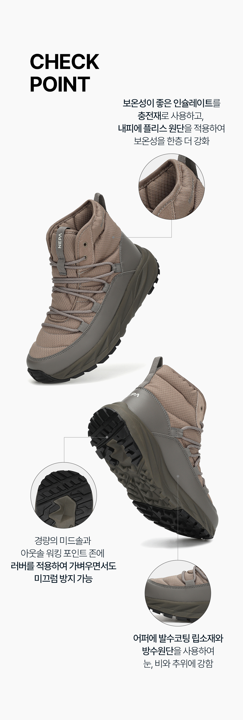 - 어퍼에 발수코팅 립소재와 방수원단을 사용하여 눈, 비와 추위에 강함