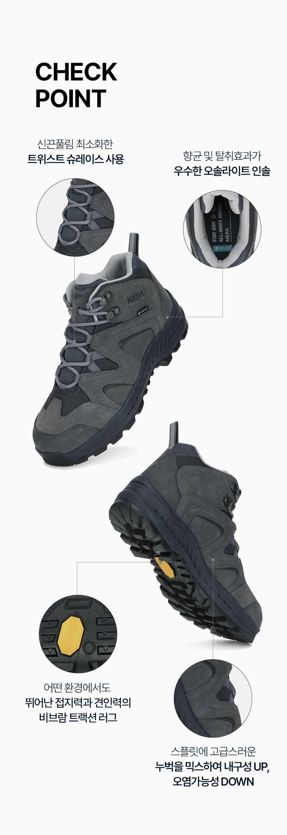 - 발 볼이 넓어도 편안한 착용감을 제공하는 와이드핏에 어떤 환경에서도 뛰어난 접지력과 견인력의 비브람 트랙션 러그