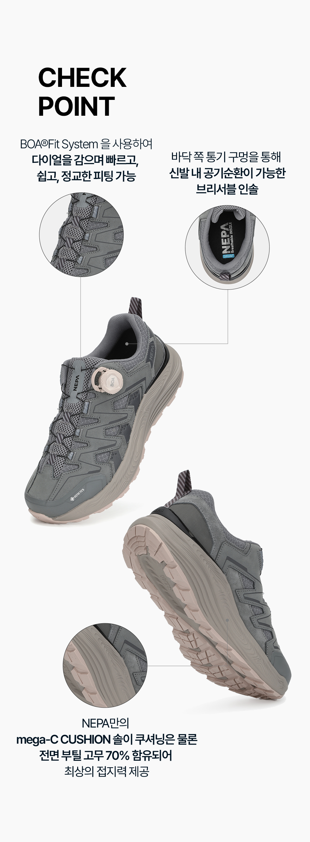 - NEPA만의 mega-C CUSHION 솔이 쿠셔닝은 물론 전면 부틸 고무 70% 함유되어 최상의 접지력 제공