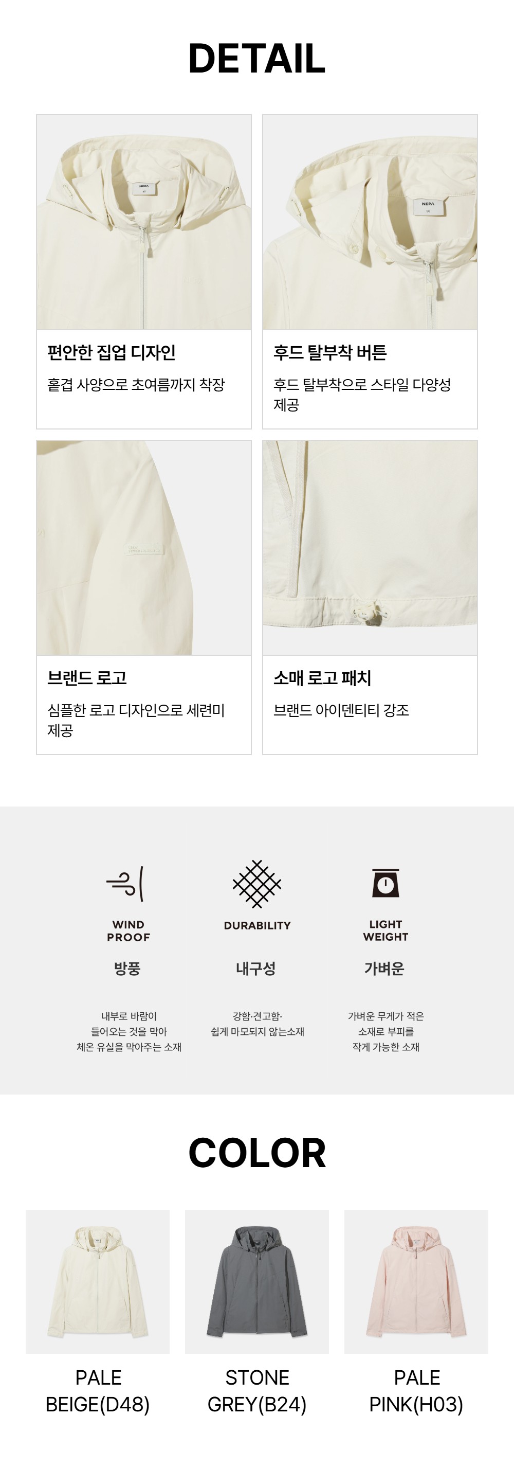 - 후드 탈부착과 소매 벨크로 디테일이 적용