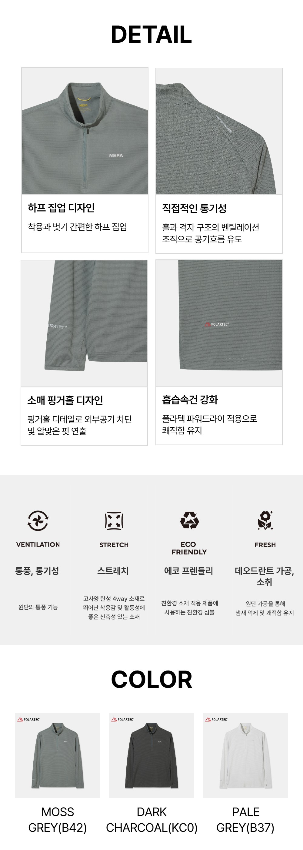 - 소매 끝 핑거홀 디테일로 외부 공기로 부터 차단시켜주며 산행 시 알맞은 핏 연출