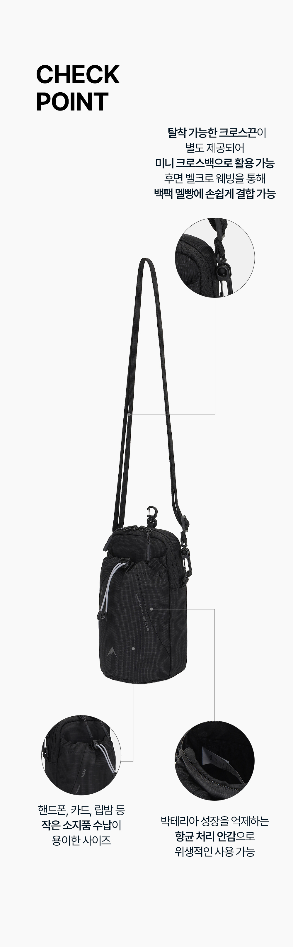 - 2WAY 기능 : 탈착 가능한 크로스끈이 별도 제공되어 미니 크로스백으로 활용 가능 후면 벨크로 웨빙을 통해 백팩 멜빵에 손쉽게 결합 가능