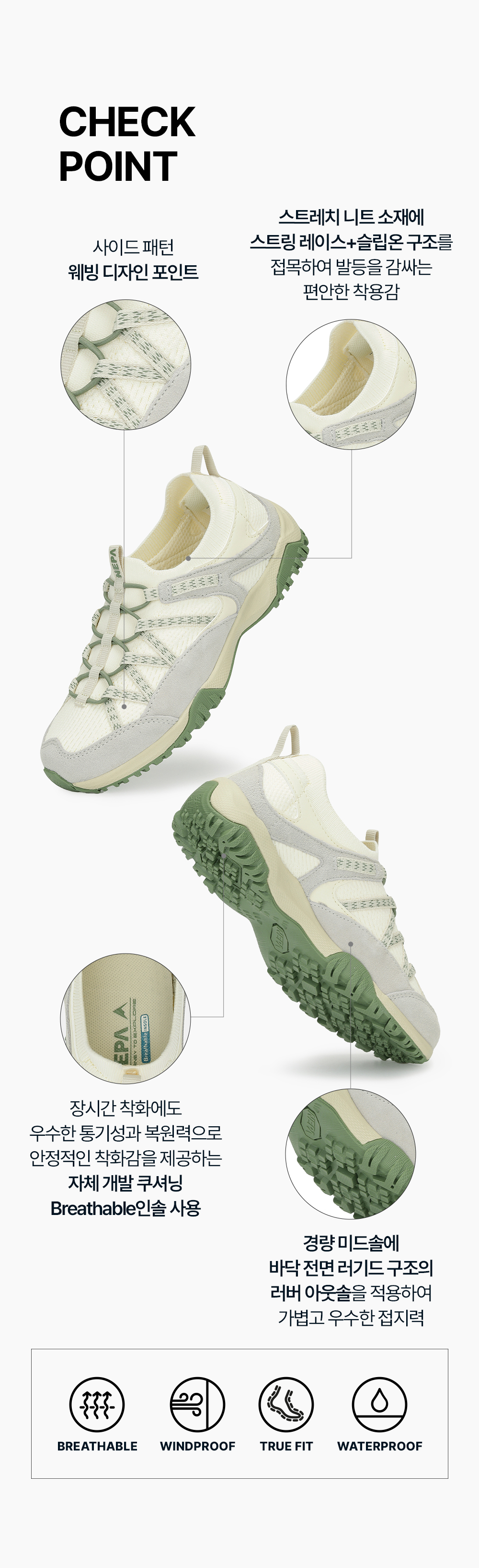 - 머드가드 패턴 디자인으로 일상 및 가벼운 둘레길 산책 시 안정적인 착화감