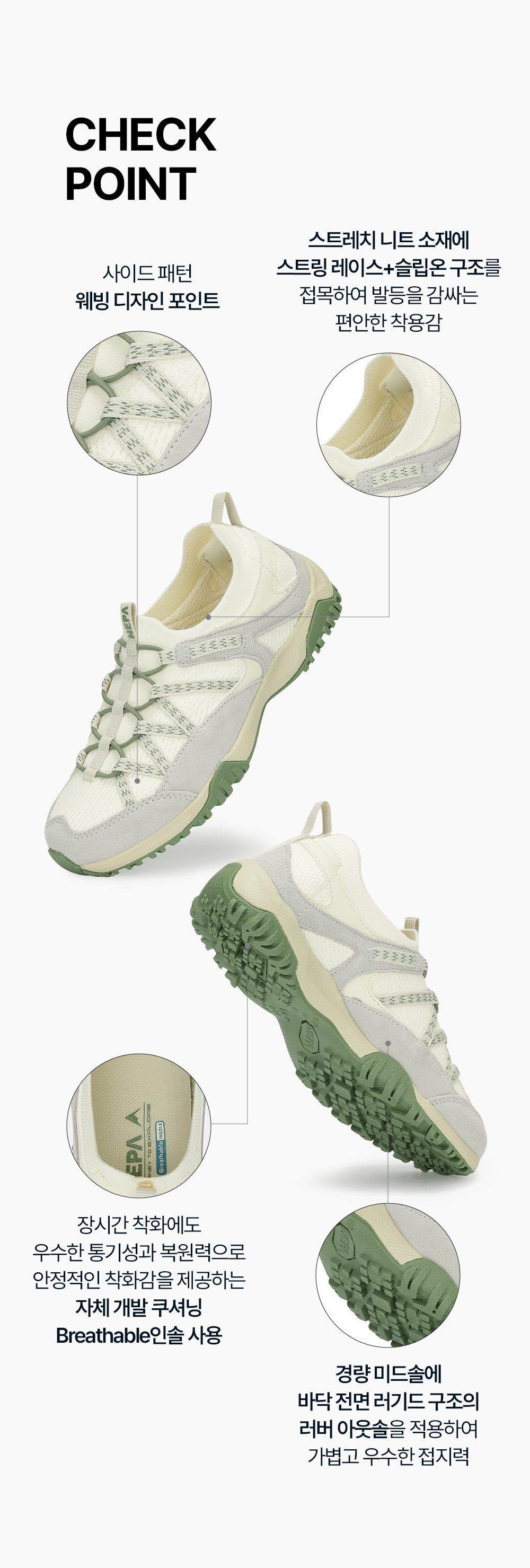 - 경량 미드솔에 바닥 전면 러기드 구조의 러버 아웃솔을 적용하여 가볍고 우수한 접지력