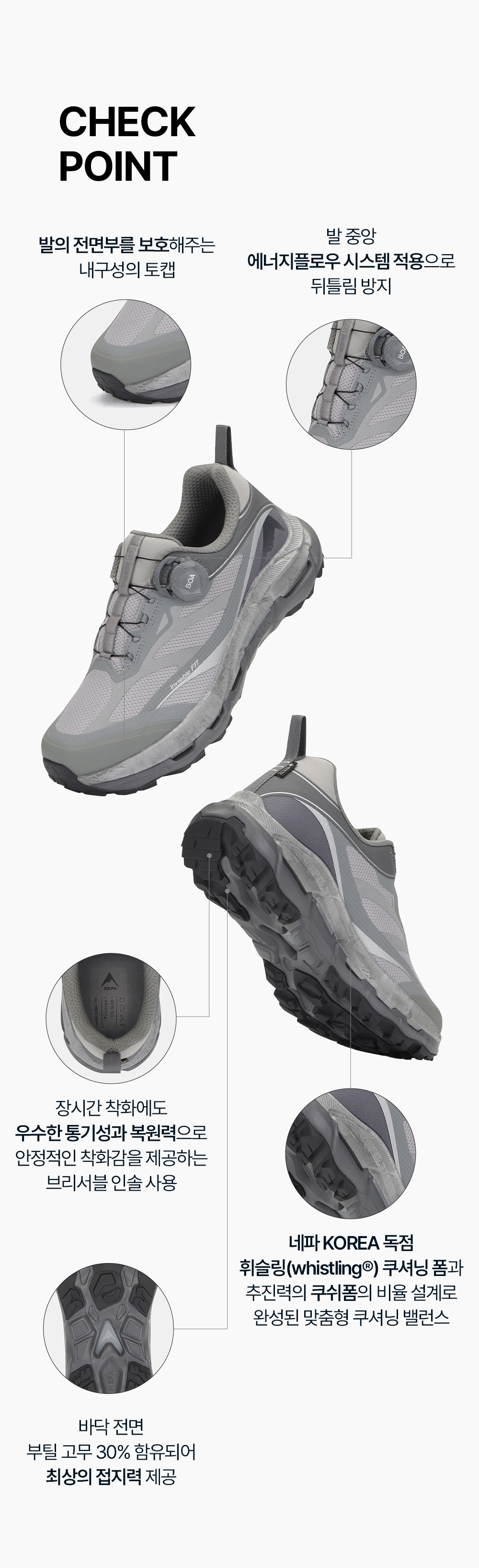 - 네파 KOREA 독점 휘슬링(whistling®) 쿠셔닝 폼과 추진력의 쿠쉬폼의 비율 설계로 완성된 맞춤형 쿠셔닝 밸런스