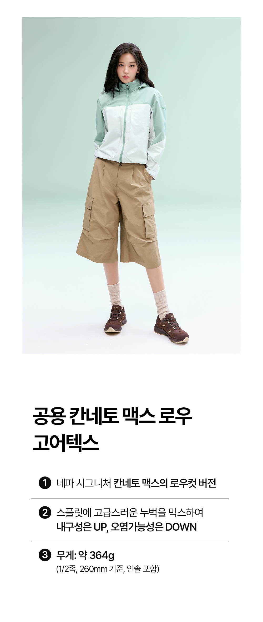 - 무게 약 364g (1/2족, 260mm 기준, 인솔 포함)