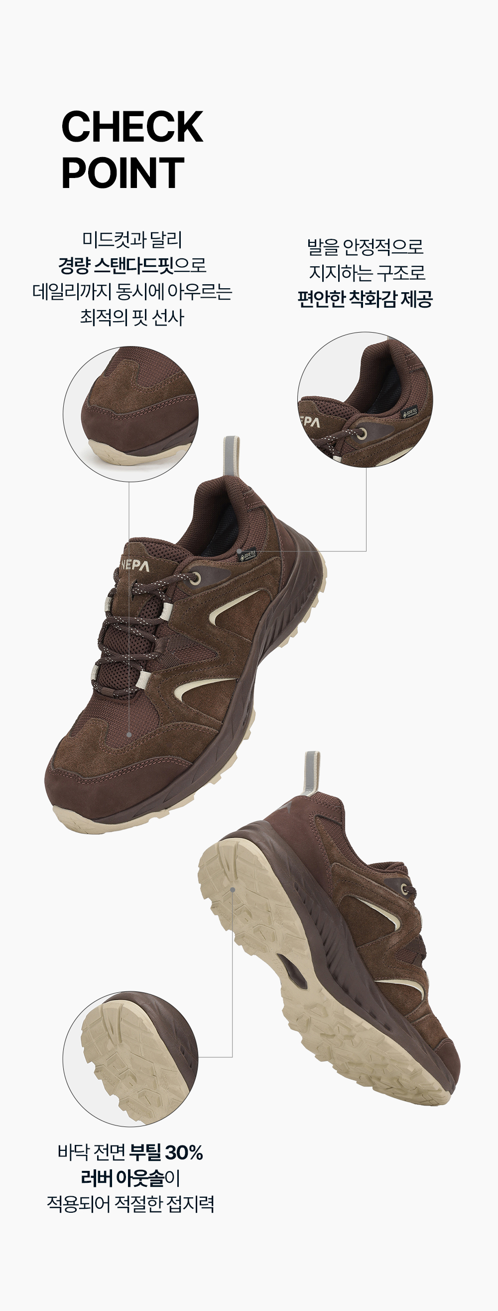 - 바닥 전면 부틸 30% 러버 아웃솔이 적용되어 적절한 접지력