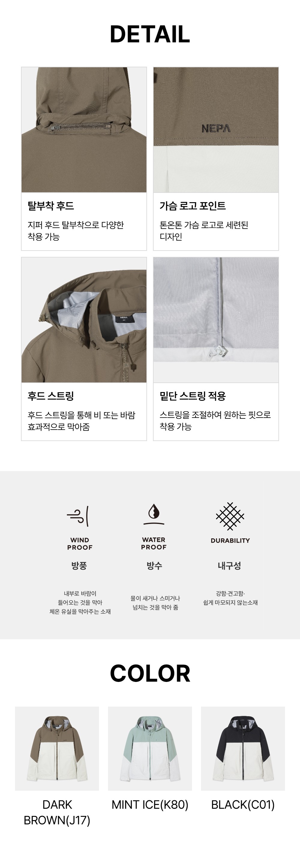 - 후드 탈부착과 소매 벨크로 디테일이 적용